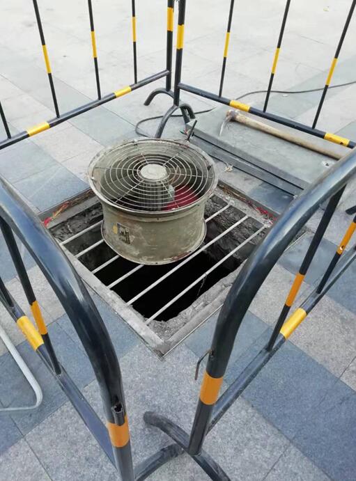 1、進(jìn)入暗渠作業(yè)前,提前1小時采用軸流風(fēng)機強制通風(fēng),把新鮮的空氣通過檢查井送至工作地點,把原箱涵里面可能存在的有害氣體排干凈。如下圖: