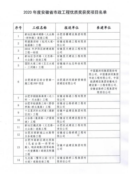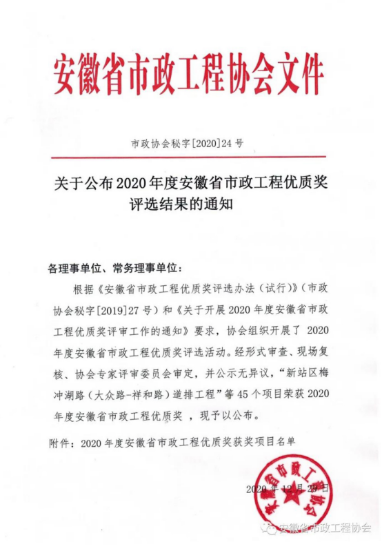 2020年12月29日,根據(jù)《安徽省市政工程優(yōu)質(zhì)獎評選辦法(試行)》(市政協(xié)會秘字【2019】27號)和《關(guān)于開展2020年度安徽省市政工程優(yōu)質(zhì)獎評審工作的通知》要求,在協(xié)會組織開展評選活動中,經(jīng)形式審查、現(xiàn)場復核、專家評審委員會審定,由安徽新建控股集團有限公司施工的全椒縣站前路道路及火車站廣場改造工程、岳西縣店前濱河新區(qū)店前河綜合治理建設項目3標段、葉集東部新城萬壽路(觀山路-未名路)、長寧路(萬佛路-雪松路)道排工程,三項工程榮獲“2020年度安徽省市政工程優(yōu)質(zhì)獎”!