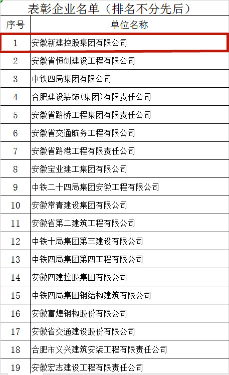 2月26日,合肥市城鄉(xiāng)建設(shè)局印發(fā)《關(guān)于對(duì)安徽新建控股集團(tuán)有限公司等62家企業(yè)予以表彰的通報(bào)(四)》(合建建管[2021]9號(hào))紅頭文件,對(duì)安徽新建控股集團(tuán)有限公司等62家企業(yè)在2020年面對(duì)疫情、汛期的不利影響,全力推進(jìn)工程項(xiàng)目建設(shè),為我市GDP過(guò)萬(wàn)億做出的積極貢獻(xiàn)進(jìn)行通報(bào)表彰,安徽新建控股集團(tuán)有限公司在該批次表彰中名列榜首。