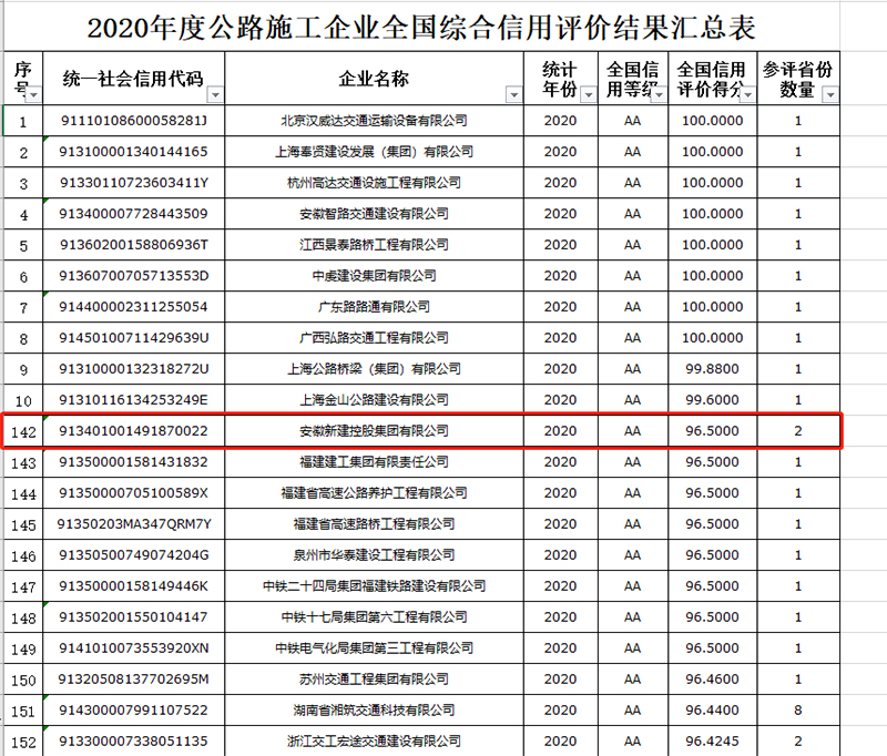 近日,交通運(yùn)輸部發(fā)布了《2020年度公路設(shè)計(jì)、施工、監(jiān)理企業(yè)和監(jiān)理工程師全國(guó)綜合信用評(píng)價(jià)結(jié)果的公示》,安徽新建控股集團(tuán)既2019年度后再次榮獲公路施工企業(yè)信用評(píng)價(jià)最高等級(jí)——AA級(jí)。