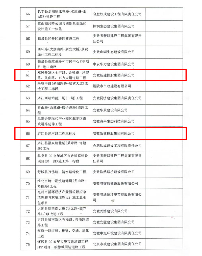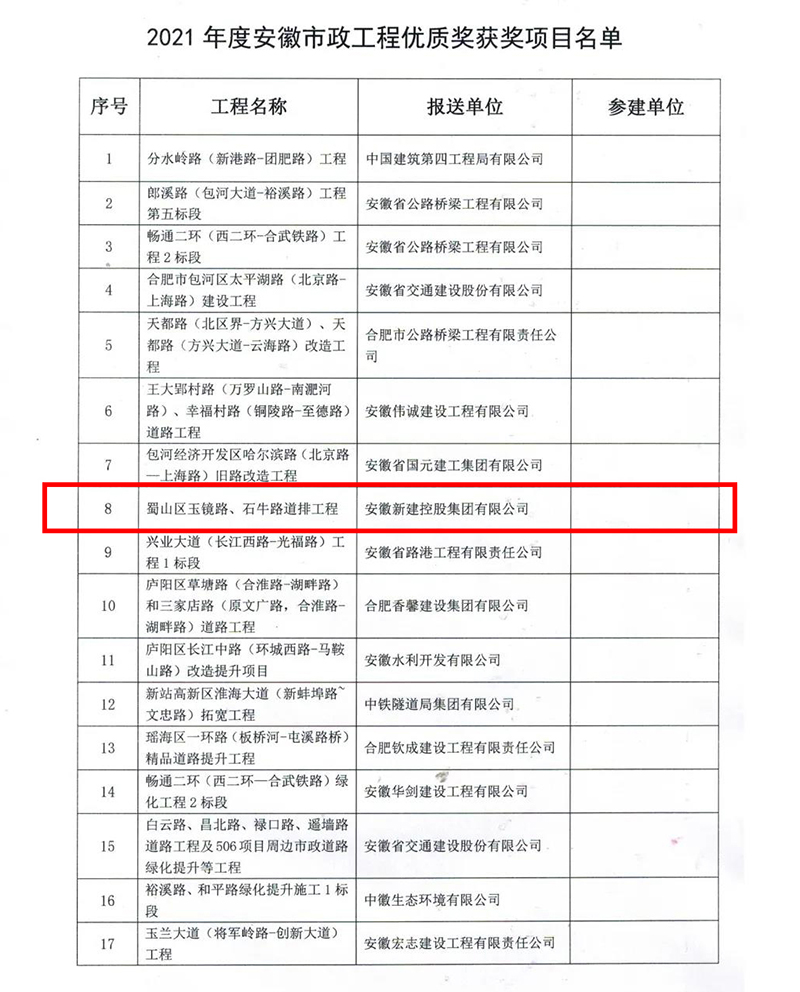 2022年1月17日,安徽省市政工程協(xié)會公布了2021年度安徽省市政工程優(yōu)質(zhì)獎評選結(jié)果的通知,經(jīng)形式審查、現(xiàn)場復(fù)核、協(xié)會專家評審委員會審定,并公示無異議,安徽新建控股集團(tuán)有限公司承建的四項(xiàng)工程榮獲“2020年度安徽省市政工程優(yōu)質(zhì)獎”!