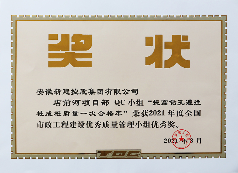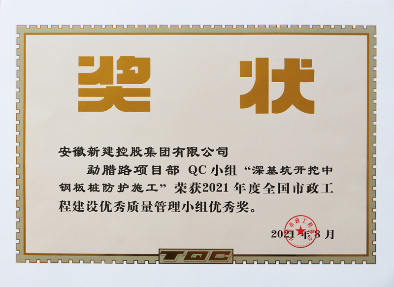 近日,中國市政工程協(xié)會頒發(fā)了2021年度全國市政工程建設(shè)優(yōu)秀質(zhì)量管理小組獲獎證書,安徽新建控股集團(tuán)2項QC小組成果“深基坑開挖中鋼板樁防護(hù)施工”、“提高鉆孔灌注樁成樁質(zhì)量一次合格率”榮獲優(yōu)秀獎,工程質(zhì)量管理繼續(xù)向前邁步。
