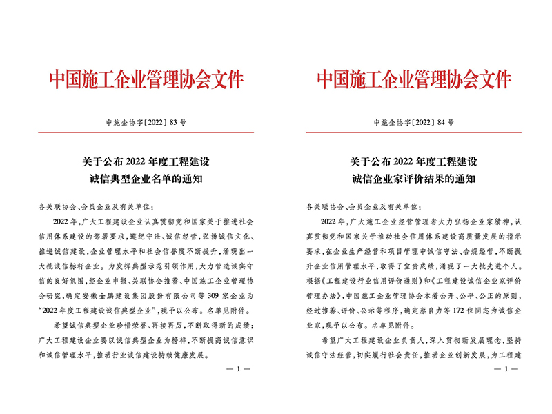 近日,中國(guó)施工管理協(xié)會(huì)發(fā)布了《關(guān)于公布2022年度工程建設(shè)誠(chéng)信典型企業(yè)名單的通知》和《關(guān)于公布2022年度工程建設(shè)誠(chéng)信企業(yè)家評(píng)價(jià)結(jié)果的通知》,安徽新建控股集團(tuán)有限公司榮獲“2022年度工程建設(shè)誠(chéng)信典型企業(yè)”,總經(jīng)理王鵬程榮獲“2022年度工程建設(shè)誠(chéng)信企業(yè)家”榮譽(yù)。