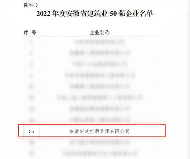 近日,安徽省住建廳公布了2022年度安徽省建筑業(yè)50強(qiáng)企業(yè)名單,安徽新建控股集團(tuán)憑借深厚的綜合實(shí)力再次榮登安徽省建筑業(yè)50強(qiáng)榜單,排序第35位。