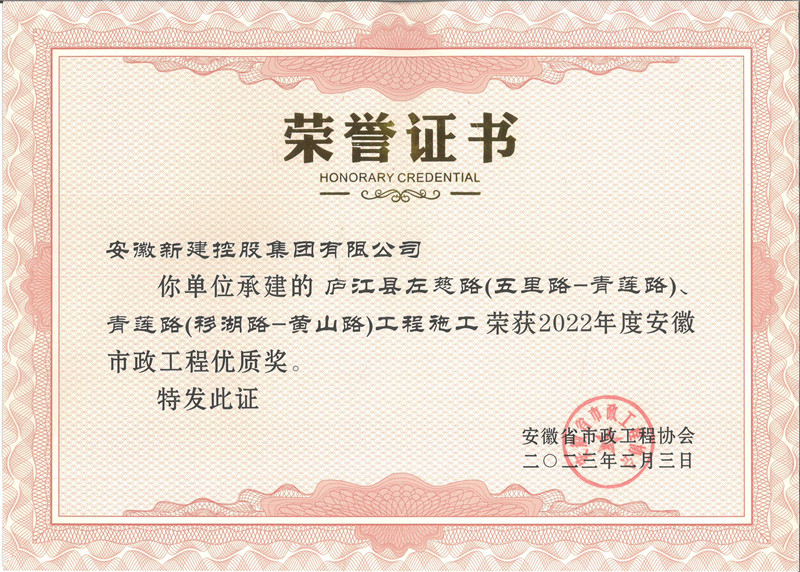 日前,安徽省市政工程協(xié)會頒發(fā)了2022年度安徽市政工程優(yōu)質(zhì)獎獲獎項目榮譽證書,集團公司承建的廬江縣左慈路青蓮路工程、全椒縣城人居環(huán)境提升工程兩項項目均獲市政工程優(yōu)質(zhì)獎。