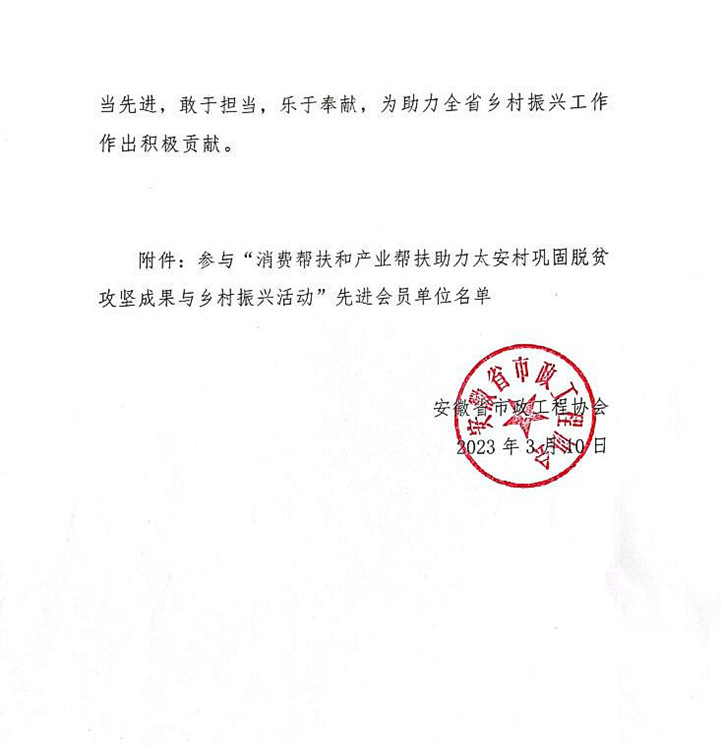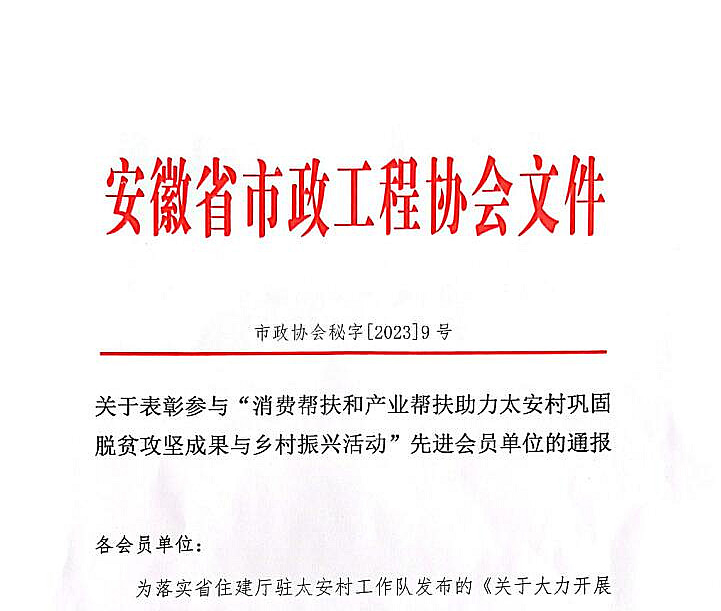 近日,安徽省市政工程協(xié)會發(fā)布關(guān)于表彰參與“消費幫扶和產(chǎn)業(yè)幫扶助力太安村鞏固脫貧攻堅成果與鄉(xiāng)村振興活動”先進會員單位的通報。表彰安徽新建控股集團在內(nèi)的三百家企業(yè),積極參與了太安村鞏固脫貧攻堅成果與鄉(xiāng)村振興活動,以實際行動履行社會責任。