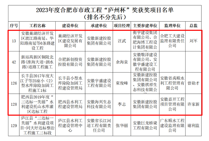 2023年9月6日,合肥市市政工程協(xié)會發(fā)布了《關(guān)于2023年度合肥市市政工程“廬州杯”獎獲獎項目名單的公示》,公司承建的安徽巢湖經(jīng)濟開發(fā)區(qū)渡江路南延、華陽路南延等6條路建設(shè)工程,長豐縣2017年度大江子等25座?。?)型水庫除險加固施工1標工程,新站高新區(qū)銅陵北路(淮海大道-泗水路)道路施工工程,肥西縣2019年度“三達標一美麗”水利建設(shè)托山水庫灌區(qū)達標工程等項目榮獲2023年度合肥市市政工程“廬州杯”獎。
