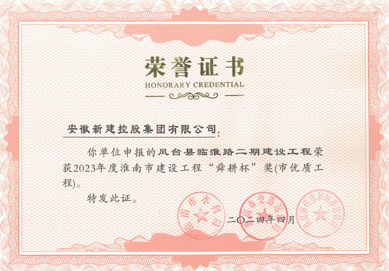近日,集團(tuán)公司收到淮南市住房和城鄉(xiāng)建設(shè)局、淮南市交通運(yùn)輸局、淮南市水利局聯(lián)合頒發(fā)的證書,公司承建的鳳臺(tái)縣臨淮路二期(西段)建設(shè)工程榮獲2023年度淮南市建設(shè)工程“舜耕杯”獎(jiǎng)(市優(yōu)質(zhì)工程)。