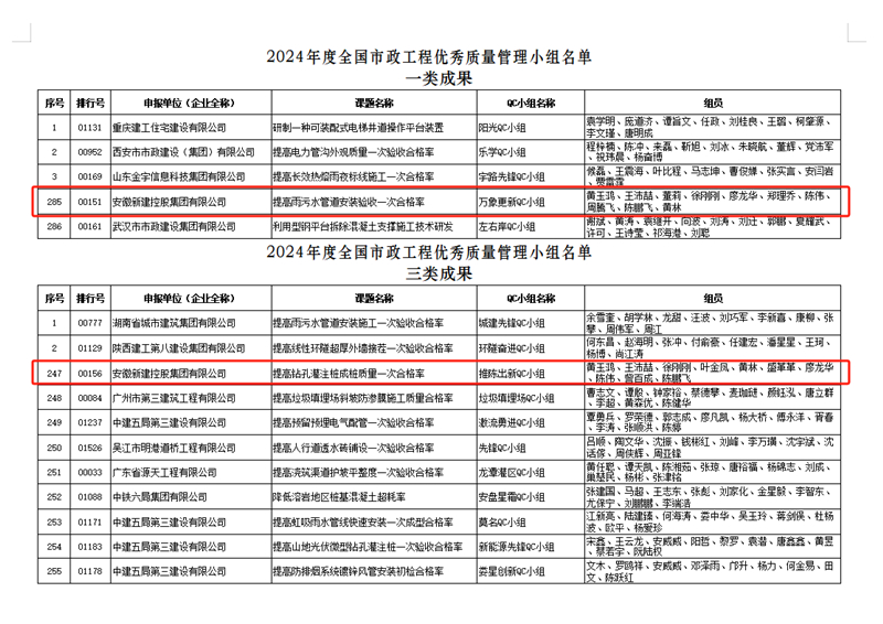 近日,中國市政工程協(xié)會公布了2024年度全國市政工程優(yōu)秀質(zhì)量管理小組名單,集團(tuán)公司萬象更新QC小組申報的《提高雨污水管道安裝驗收一次合格率》榮獲一類成果;推陳出新QC小組申報的《提高鉆孔灌注樁成樁質(zhì)量一次合格率》榮獲三類成果。