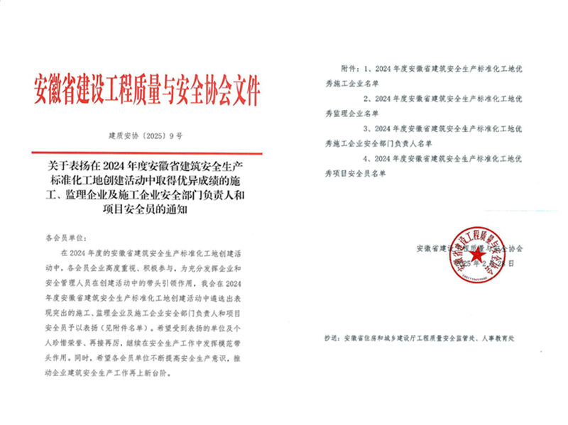 公司始終秉持“安全第一、生命至上”的原則,不斷強化現(xiàn)場隱患排查,嚴格按照安全生產(chǎn)標準化工地建設(shè)要求,持續(xù)提高施工現(xiàn)場標準化應(yīng)用水平。此次評選結(jié)果,是對安徽新建安全環(huán)保管理體系、規(guī)范的施工現(xiàn)場布置、卓越的安全環(huán)保管理和文明施工水平的充分肯定。