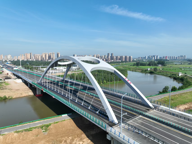 該項(xiàng)目道路等級(jí)為一級(jí)公路兼城市主干道,采用雙向六車道設(shè)計(jì),設(shè)計(jì)時(shí)速60 公里,標(biāo)準(zhǔn)段紅線寬 32 米。路線總長(zhǎng)約 2.445 公里,其中襄河大橋全長(zhǎng) 653.5 米。主橋采用 120 米下承式鋼箱系桿拱橋結(jié)構(gòu),如鋼鐵長(zhǎng)虹般橫跨襄河,成為全椒交通新地標(biāo);引橋則采用預(yù)應(yīng)力混凝土組合箱梁結(jié)構(gòu)。項(xiàng)目總投資額約 2.576 億元,合同工期為 720 日歷天。