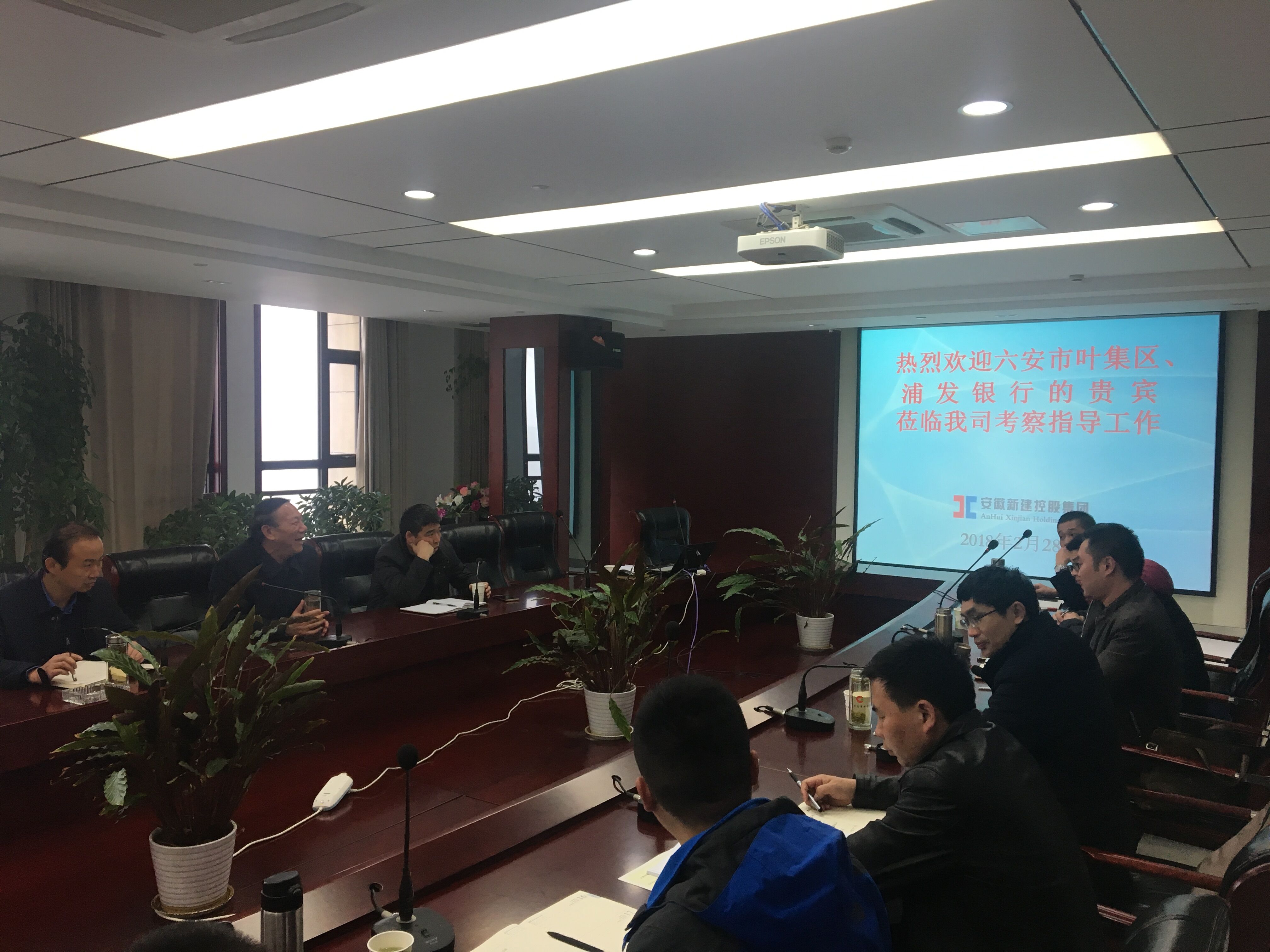 2018年8月28日上午,六安市葉集區(qū)財政局副局長、浦發(fā)銀行蕪湖分行熊赟副行長、六安市葉集建設(shè)投資經(jīng)營有限責(zé)任公司王磊董事長等一行來我公司洽談工程項目融資事宜,安徽新建控股集團有限公司王杰英董事長及相關(guān)領(lǐng)導(dǎo)熱情接待。