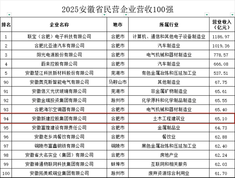 10月16日上午,2025年安徽省民營企業(yè)百強發(fā)布會在合肥隆重舉行。安徽省工商聯(lián)、省發(fā)改委、省工信廳、省市場監(jiān)管局及省人力資源和社會保障廳聯(lián)合發(fā)布了2025年安徽省民營企業(yè)營收百強、制造業(yè)百強和服務(wù)業(yè)百強榜單。安徽新建控股集團在2025年安徽省民營企業(yè)營收百強榜單中位列第94位,這一成績?nèi)〉贸浞终宫F(xiàn)了集團公司不斷增強的綜合實力。