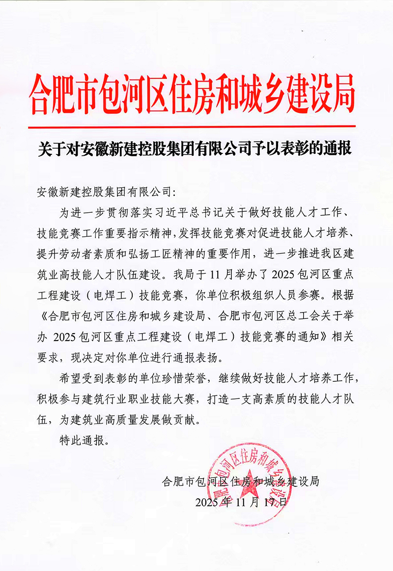 11月17日,從合肥市包河區(qū)住房和城鄉(xiāng)建設(shè)局傳來喜訊,我公司因在“2025包河區(qū)重點(diǎn)工程建設(shè)(電焊工)技能競(jìng)賽”中的出色組織和積極參與,獲得主管部門通報(bào)表揚(yáng)。這一榮譽(yù)是對(duì)我公司在技能人才培養(yǎng)和高素質(zhì)隊(duì)伍建設(shè)方面工作的充分肯定。