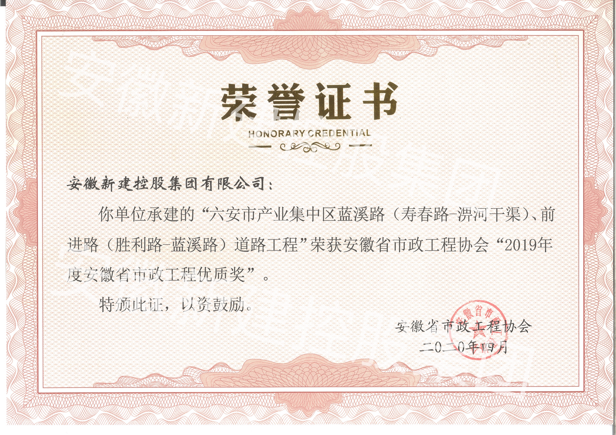 近日,從安徽省市政工程協(xié)會傳來喜訊,由我單位承建的“葉集區(qū)城區(qū)道路改造工程”、“六安市產(chǎn)業(yè)集中區(qū)藍(lán)溪路、前進(jìn)路道路工程”、“鳳陽寧國現(xiàn)代產(chǎn)業(yè)園文賢北路、鳳祥路等三條道路工程”、“葉集實(shí)驗(yàn)區(qū)東部生態(tài)新城一期路網(wǎng)標(biāo)段道排工程、花園東路道排工程”等四項(xiàng)工程榮獲“2019年度安徽省市政工程優(yōu)質(zhì)獎”。